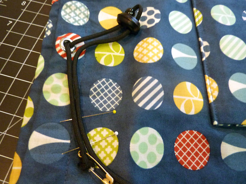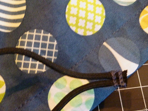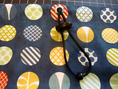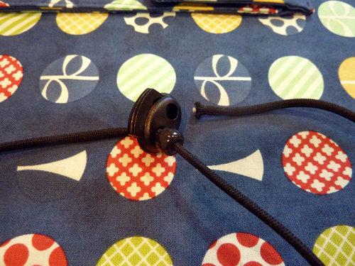 - Slip the seamed ends back through the grommet and adjust the cording until the seamed ends are sitting at the back of the bag. Adjust the loop to center the bead.