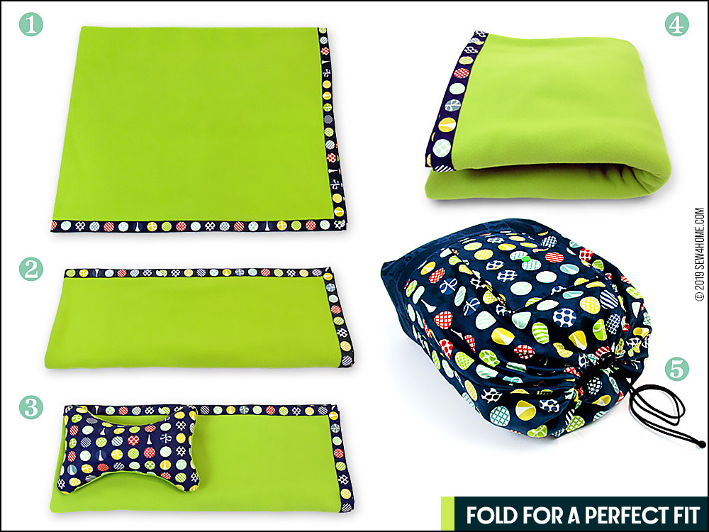 - As shown in the intro above, fold the blanket, then wrap it around the pillow to create a compact package to insert into the bag. Cinch the cord to close the top and off you go!