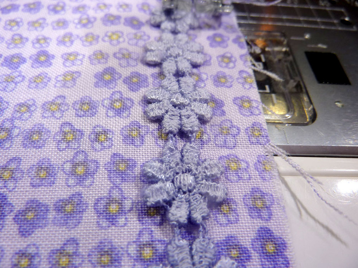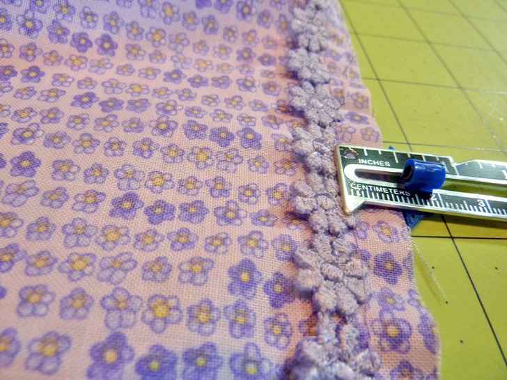 - Find the 41″ length of lace. Place the lace on the right side of the outer loop. You will need to futz with the exact lace placement based on the lace you select. For our daisy chain lace, we wanted over half of the flower showing beyond the seam. You’ll be using a ½” seam allowance, so set your seam gauge to ½” and adjust the lace below this mark until you have the reveal you want. In our case, the top edge of the flower was ⅜” from the raw edge of the fabric.
