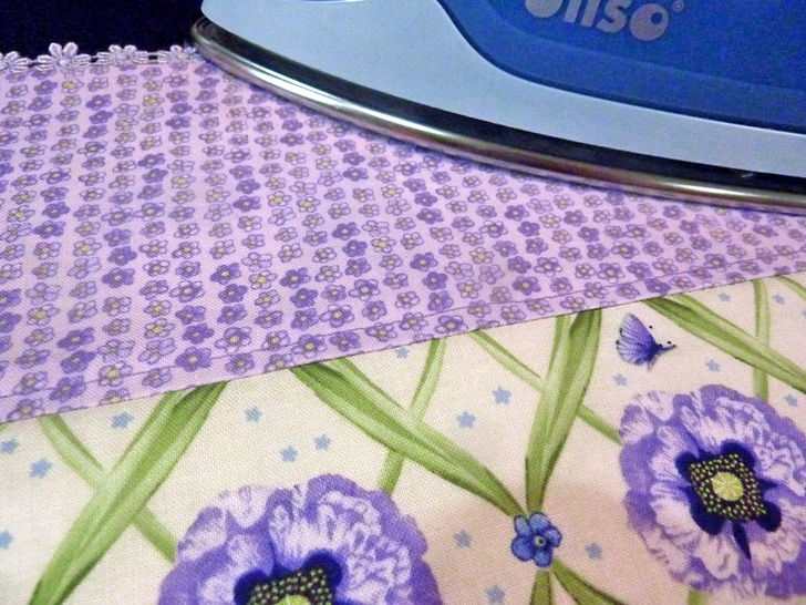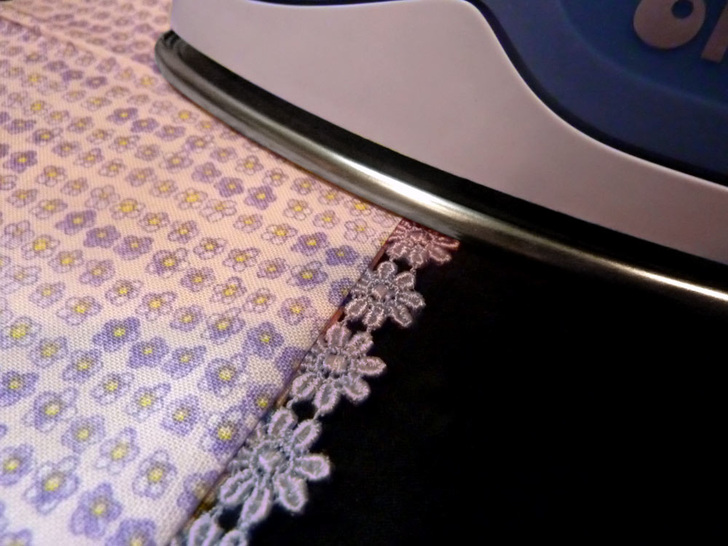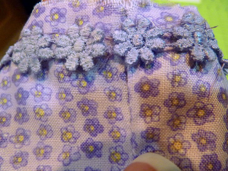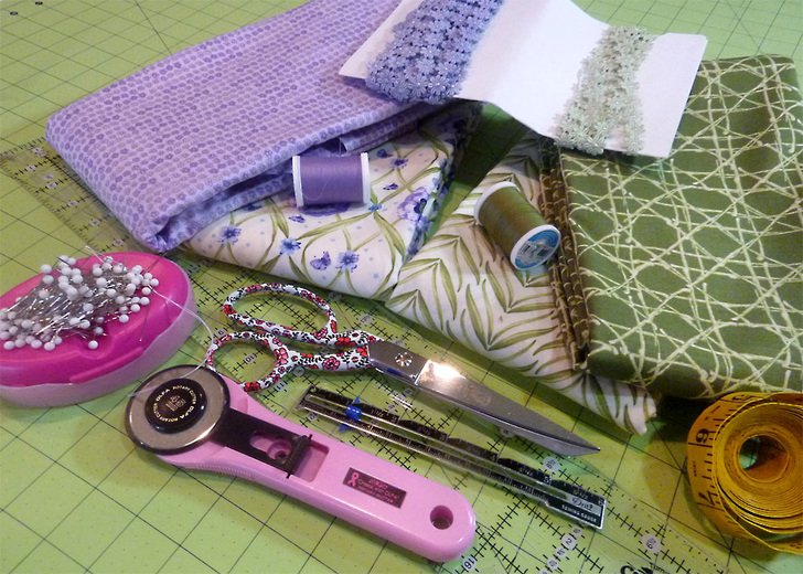 NOTE: You could purchase lace from your favorite outlet to match, which is what we did for our green lace. Can’t find exactly the color you want? For a perfect match, try our method: buy a natural cotton or cotton blend lace (polyester doesn’t hold the dye well) and dye it to match with Rit Dye. If you choose this method, buy enough extra lace so you can experiment with the intensity of the dye before creating the final length. We used Rit Dye powder and a blend of equal parts Denim Blue and Purple to create our lovely lavender. We watered down both and reduced the recommended time in the dye to get the best look. Again, get some extra lace so you can experiment. - All purpose thread to match fabrics