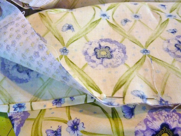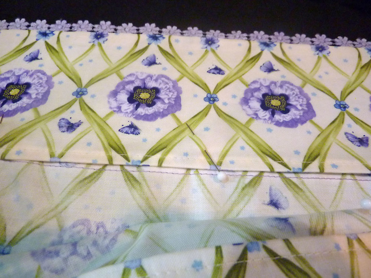 - Pin all around, matching the raw edge of the pillowcase body with the raw edge of outer loop. You’ll need to move the hemmed edge of the inner loop out of the way; you are just working with the two layers.