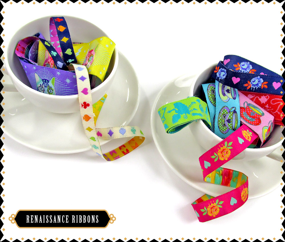 The coordinating ribbon from Renaissance Ribbons pulls out some of the most striking motifs seen on the fabric, from the card suites to the teacups to the Cheshire Cat, and more. We love that the widths are so varied, from a skinny ⅜” to an extra bold 2”.