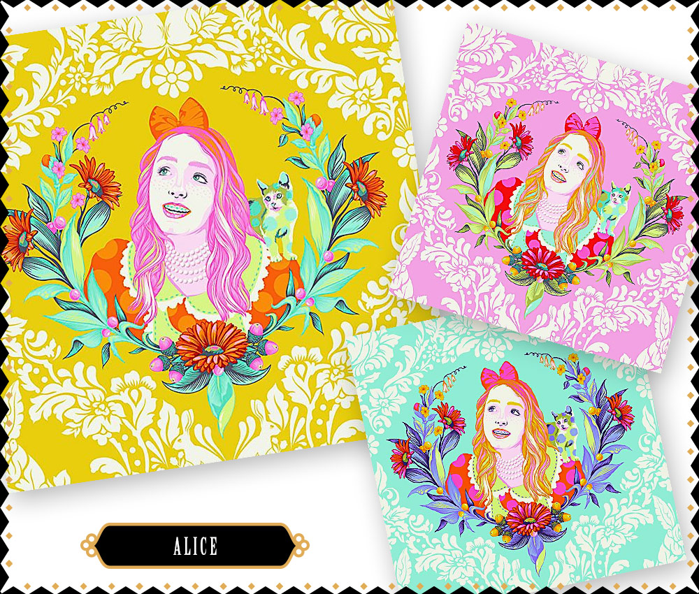 If you are a fan, as we are, of Alice’s Adventures in Wonderland, you’ll recognize many of the most memorable themes and characters from the story that have come to life in fabric. The star of the collection is, of course, dear Alice. Tula explained, in one of her early videos about the development of the collection, how her rendition of Alice is based on a photo of her little sister, Jo. In the fabric portrait, Alice sits in a sweet wreath of daisies with her cat, Dinah on her shoulder. In the background are the white rabbits poised to lead Alice away.