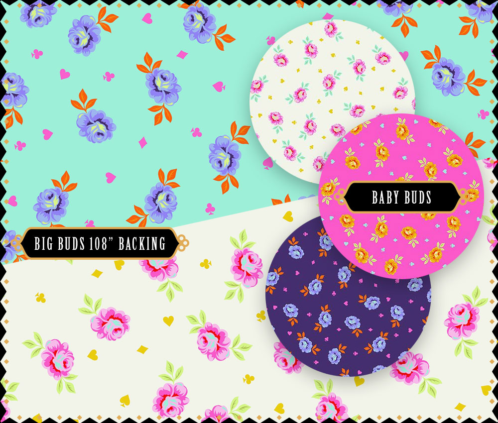 We love the Tea Time teacups, which seem ready to celebrate a boisterous Unbirthday. Another favorite is the Cheshire Cat who looms in the night sky watching over Wonderland. Tula’s imaginative Painted Roses are dripping with wet paint as they sit on a background of oversize spots, hoping to blend in and escape the Queen’s notice. Speaking on the Red Queen, she is here as well in all her striking evil elegance. There are coordinating Baby Buds and the two 108” back fabrics feature Big Buds.