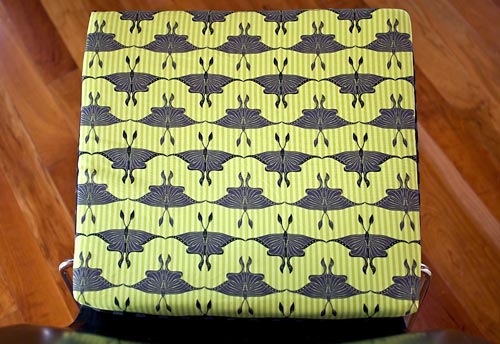 NOTE : You’ll notice the piping is slightly offset at the corners. Now, there are bound to be some of you who are driven slowly insane by this off-set. To you I say, ‘But you didn’t have to make a gusset!!’ That’s the whole idea of this project. It’s a thick and comfy chair pad with nice boxed corners and a lovely piping accent, but you didn’t have to use the much-more-complex gusset technique. And, I bet, unless you spend the entire day down on one knee staring at the cushion corners, you’ll forget about that tiny off-set in about five minutes. I’ve forgotten about mine already. If you’d like to learn more about making a box corners, check out our full Box Corners Tutorial. If you’d like to learn about gussets and piping, try out our project: Box Style Tufted Floor Cushions. - Insert foam and have a seat.