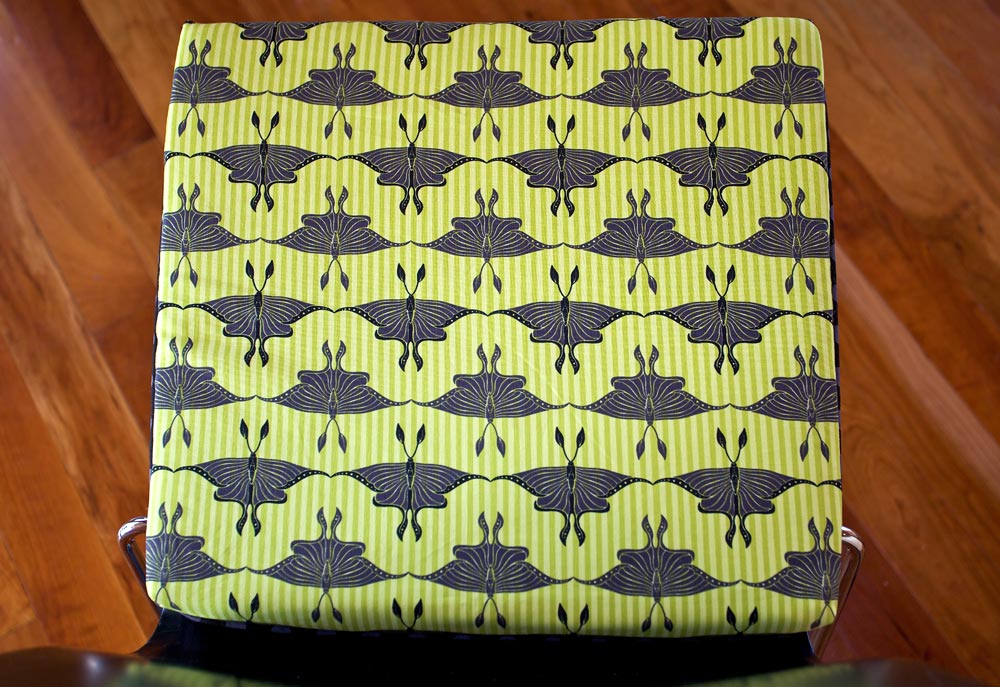 NOTE: This overlap creates the back envelope opening, which allows you to insert the foam. It also means you can remove the covering and launder it after the inevitable Morning-Cheerio-Milk Incident. - Pin securely, then flip the whole thing over, and trim the cushion bottom fabric flush with the cushion top.