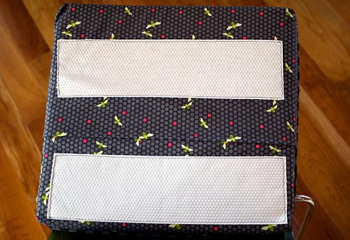 - Place a 4″ x 12″ piece of gripper fabric face up on each cushion bottom piece approximately 2″ from the long raw side edge and centered top to bottom.
