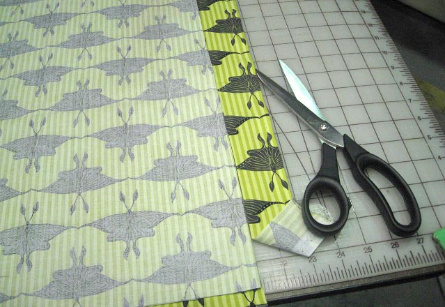 NOTE: How did we figure this measurement? Go back once again to your foam insert pattern (pattern one). The width is the most critical. To your finished width (ours was 15¾” at the widest point but we rounded up to 16 to make the math easier) add 1½” for the outer box corner of EACH, 1″ for a hem along EACH overlap, and 4″ for a generous overlap. For our sample, the equation was: 15¾” + 1½” + 1½” + 1 + 1 + 4 = 25″ but you need to cut that in half because you need TWO panels. So, the final width was 12½”. The height was simply half the width of fabric to make it an easy slice across the main fabric panel. As you’ll see below, you’ll use your top panel as a pattern and will trim away the excess height for a perfect match. - Cut 1½” x width of fabric strips from the piping fabric.