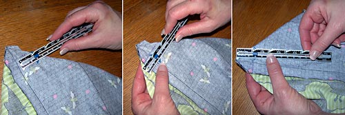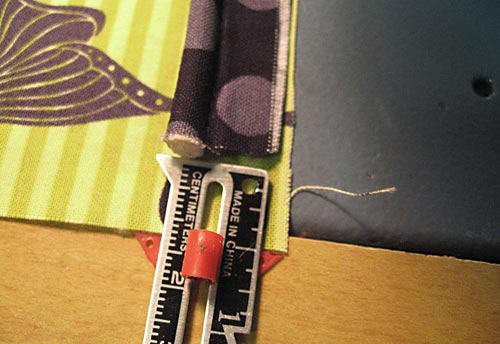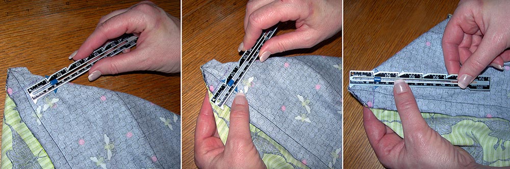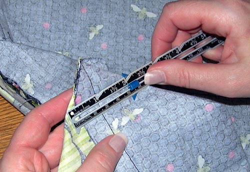 - When your seams are aligned and you have your perfect triangle peak, set your seam gauge to 2″ and slide it down the peak until it hits a width of exactly 2″.