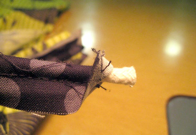 - At each end of each piping piece, use your seam ripper to gently peel back the fabric to expose the cording underneath.