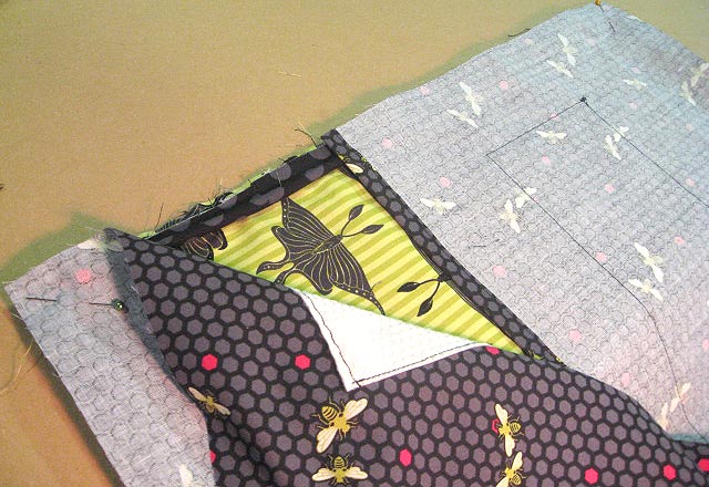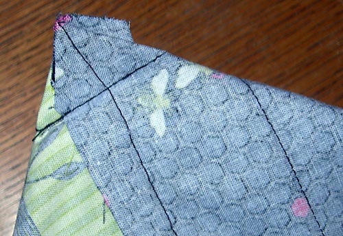 - Stitch along the drawn line. Stitch back and forth along the line two or three times to reinforce. In most box corners, we recommend trimming away the “excess triangle” close to the stitching line. In this case, because we are using just a lightweight quilting cotton, we recommend leaving that excess in place as a bit of extra reinforcement at the corner.
