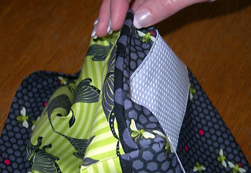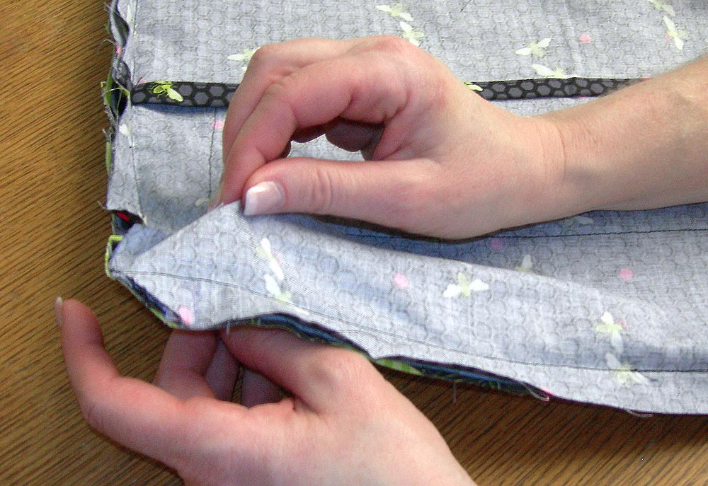 - As you keep pulling, the fabric will begin to make a little peak with the trimmed corner point at the top and the seam lines running down the middle of the front and the back.