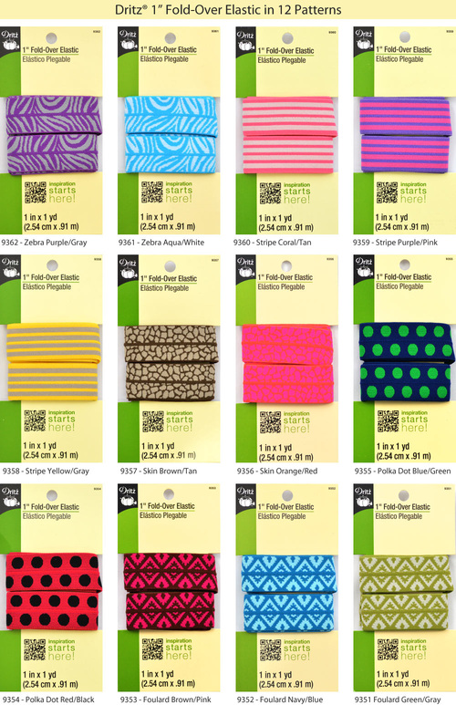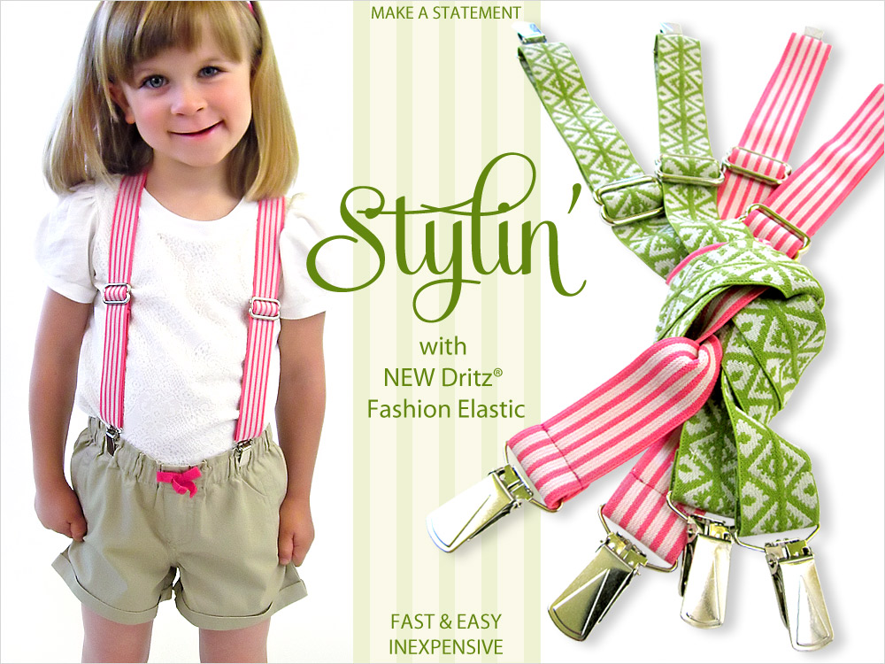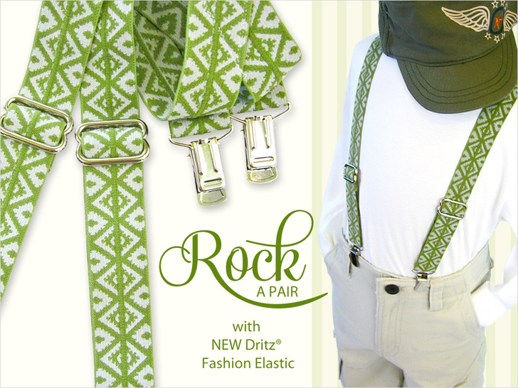 Used to be, you had to cover elastic with fabric to get fashionable suspenders. No more! With Dritz® FOE (Fold-Over Elastic – NOT Fraternal Order of Eagles) a stylin’ pair of ‘penders is a whip-it-up project you can do in under an hour. In fact, these are so easy and inexpensive, you could make a pair for nearly every outfit in the closet in nothing flat. There are 10 solid colors and 12 patterned options of Dritz® Fold-Over Elastic. From brights to pastels, colorful to classic. Something for any occasion or outfit.