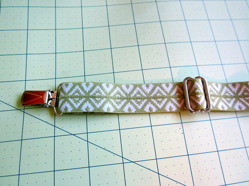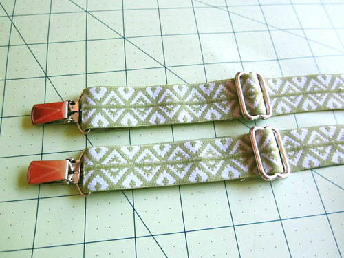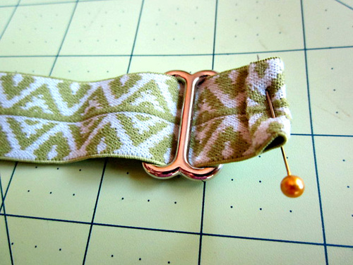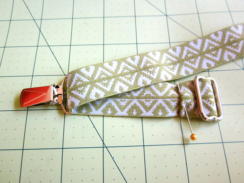 - Slip the opposite raw end of the elastic through one suspender clip. (Yes… we know in the photo below that end is still just pinned – just close your eyes and imagine it’s really stitched down.)