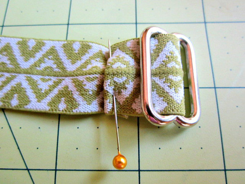 - Thread the raw end back through the slider, weaving back over the center bar. The stitched down end is now hidden between the two layers of elastic.