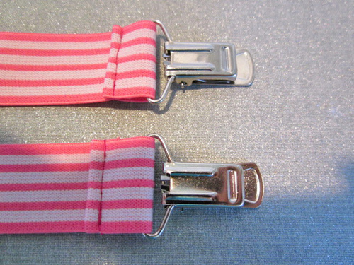 - Slip each remaining raw end of each elastic length through a suspender clip.