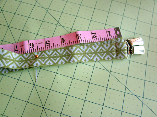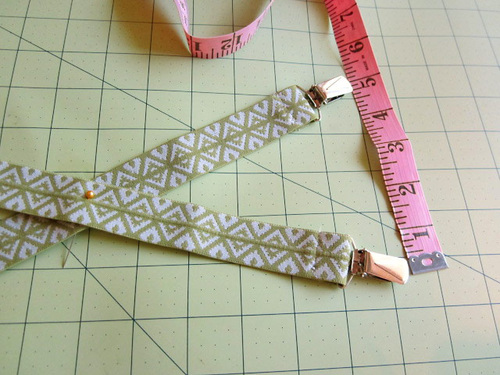 - Using this pin, pivot apart the two lengths of elastic until there is about 5″ between the suspender clips.