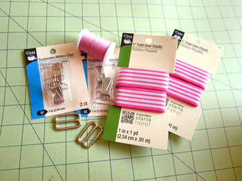 - TWO packages of Dritz® Fold-Over Elastic; we used Green/Gray Foulard for our “boy suspenders” and Coral/Tan Stripe for our “girl suspenders”