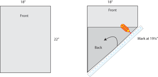 - Measure along the folded edge, from the bottom point up, to your width plus 1″. In our sample, we measured to 19¼” and made a mark.