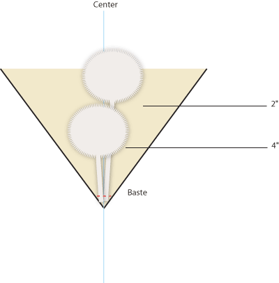 - Machine baste a pair of poms in place at the point of one triangle. Keep your basting within the seam allowance. Place one pom so it will hang about 2″ from the finished point and the second so it will hang about 4″ from the point.