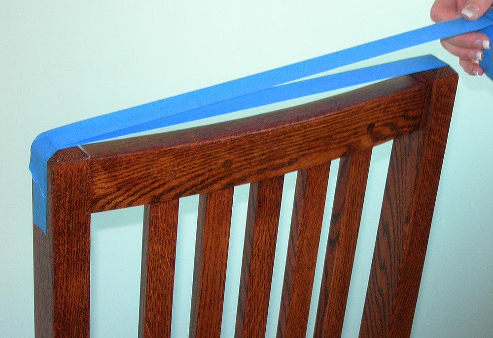 Our chair cover design works best on a chair with a straight back and top. If your chair has short little posts, you can try our little ‘tape trick’ shown below: simply stretch a couple pieces of painters tape across to create a level top.
