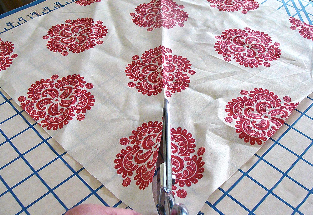 - For each accent triangle (Floral Christmas in our sample), you need a square of fabric whose diagonal measurement is the same as the width of your cut chair fabric, plus one inch for the seam allowance. In our sample, that would be 18¼ + 1 = 19¼”. And you want to fussy cut the fabric so your accent triangle has a nicely centered pattern.