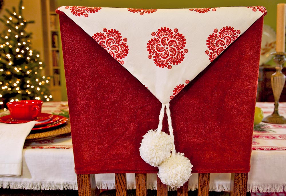 Ah! Pity the naked chair. Everyone comes to the dinner table in their holiday finery and the chair pulls up without a stitch on. An elegant cover not only avoids embarrassment for your mild-mannered chair, it doubles the decorative charm of the entire room. And really… why should the table have all the fun? Our festive cover features an accent ‘collar’ with pretty dangling pom-poms. It’s what all the best-dressed chairs are wearing this season.