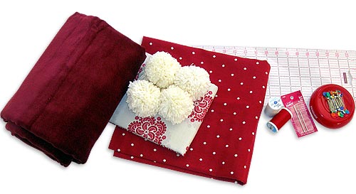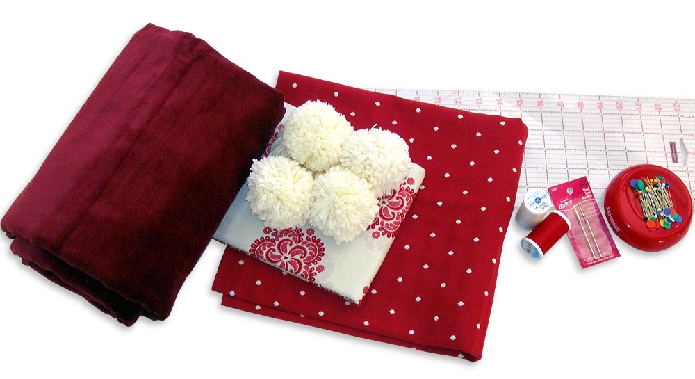 - 1 yard of 44-45″ wide fabric for cover fronts: we used Lumiere de Noel by French General for Moda Fabrics in Red Dobby Dot