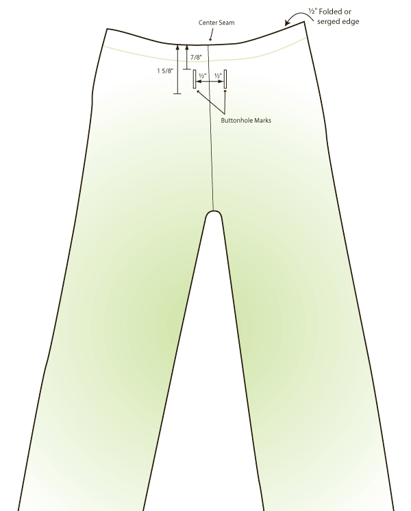 - Find the center seam on the front of the pants. Measure ½” from either side of the center seam. Measure 1-5/8″ from the top of the pants and place a mark, then measure 7/8″ from the top of the pants and place a mark. Use the diagram below for reference. This will be the top and bottom points of your vertical buttonholes. If you needed to adjust the waistline in the fitting, you may need to adjust the location of your button holes slightly. The buttonholes should be approximately ¾” long, and centered in what will be the top hem of the pants.