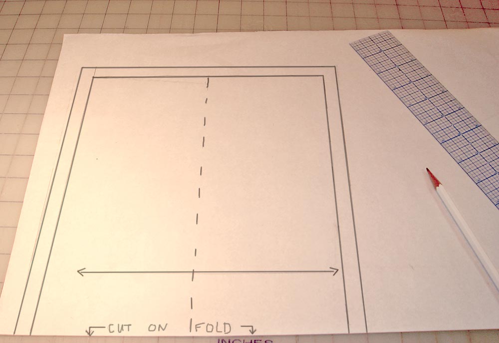 - Place this rectangle on a new piece of blank paper, trace it, then flip it over and trace the opposite side. The middle of this new, double-in-size rectangle should still be indicated with a dashed line. Again, this dashed line is the bottom of the cuff and will be helpful for placement when fussy cutting the fabric.