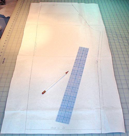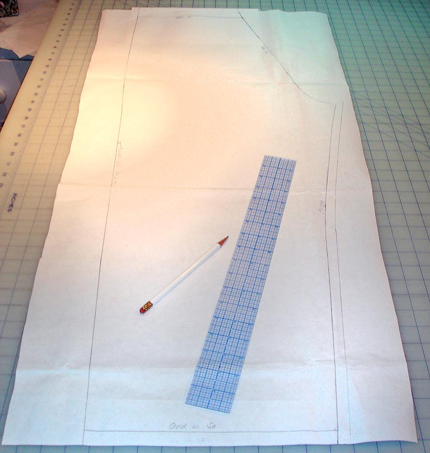 - Draw a line parallel to the bottom of the pant leg, at the same depth as the finished cuff. In our sample, that meant we drew a line 4½” UP from the bottom edge of the original traced pattern.