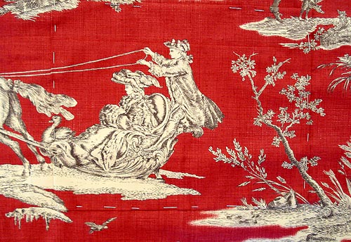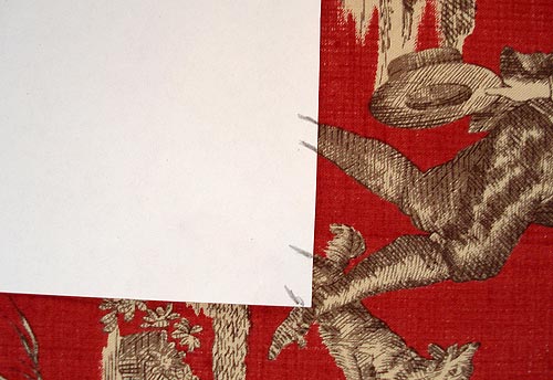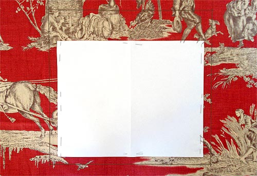 The pastoral pen-and-ink drawings on the front are a classic toile design in rich red and cream. The back’s subtle tone-on-tone pattern features graceful birds and blooms; the perfect neutral palette to set off the warm colors of the binding and ties.