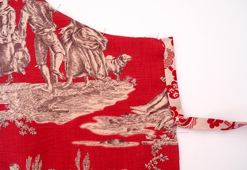 9. Pin one waist tie at each lower armhole corner on the FRONT of the apron. Butt the edge of the tie right up against the binding of the apron.