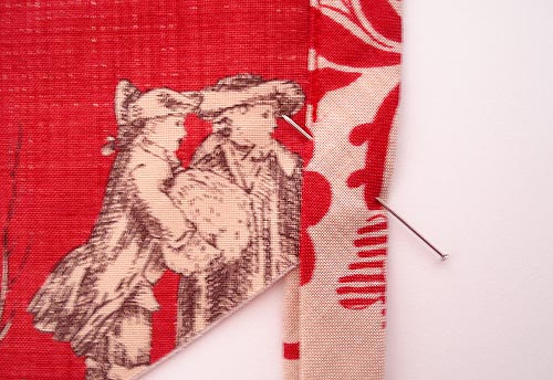 3. Pin the pocket on the right side of the apron, carefully lining up the motif on the pocket to the motif on the apron.