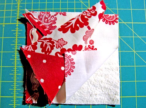 NOTE: I fussy cut all my fabric squares. On the backs, I made sure all my dots were straight and the coordinated print square had a strategically placed pattern for the final triangle. On the fronts, I made sure I had a featured motif in the center of each.