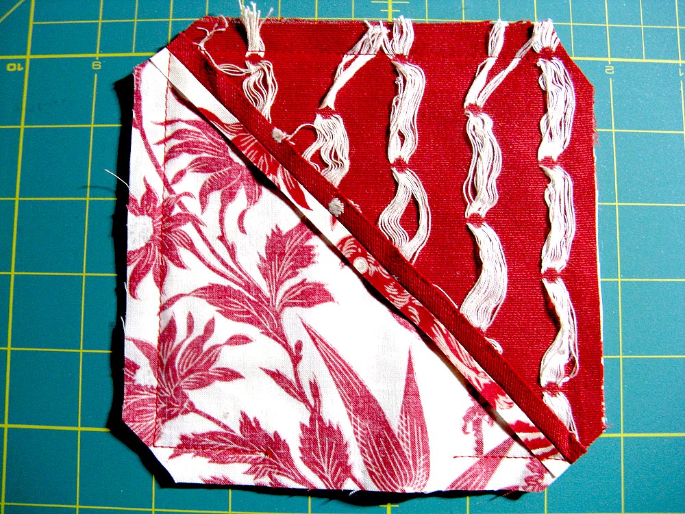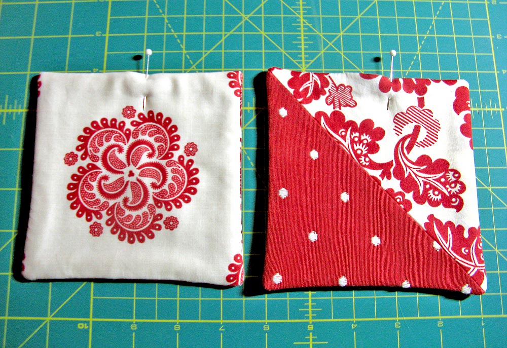 - Find the two 6″ x 6″ back squares. Cut each square in half diagonally to create two triangles.