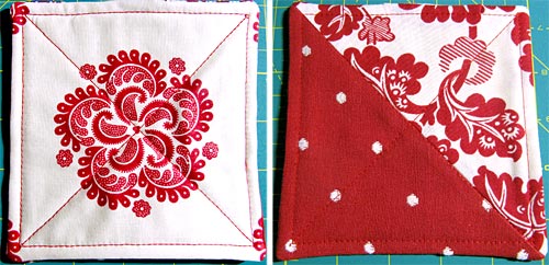 A sparkling diamond ring (so lovely). The coveted brass ring (so tempting). The mythical Lord of the Rings (that Elf was so handsome). The unsightly furniture ring (note to self: keep Uncle Frank away from the antique sideboard). If you hate rings on your furniture, you’ll love these coasters. A sewing project doesn’t get much easier than this one; just cut, stitch, press. I made all four of our samples in under an hour, and I was stopping to take pictures!