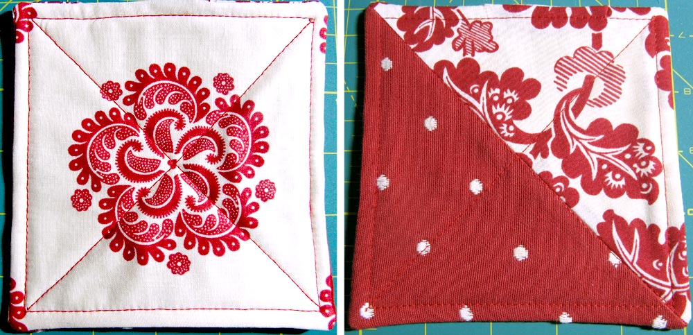 - The coasters finish at 5″ x 5″. Each coaster takes two 6″ x 6″ squares for the back, one 5½” x 5½” square of batting and one 5½” x 5½” square for the front.