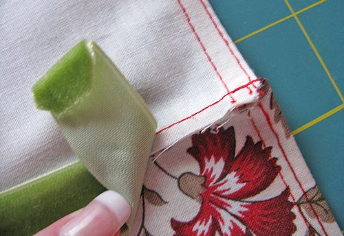 NOTE: Pivoting at the corners of the ribbon will be a bit of a challenge because you are working through multiple layers close to the edge of the fabric. Once again, my Janome was able to power through with barely a notice. If your machine normally has challenges with layers and edgestitching, you might need to stop with your needle in the down position to pivot and then turn the machine’s handwheel manually to slowly make your way around the corner.