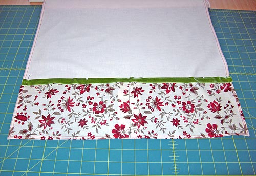 NOTE: Yes, this means your seam will show on the RIGHT side of the towel. That’s okay. We’re going to cover it up with the ribbon and then the back will have a nice, clean finish. - Stitch the accent band to the body, using a ½” seam allowance. Trim the seam allowance back to ¼”. Press the seam allowance down towards the accent band.