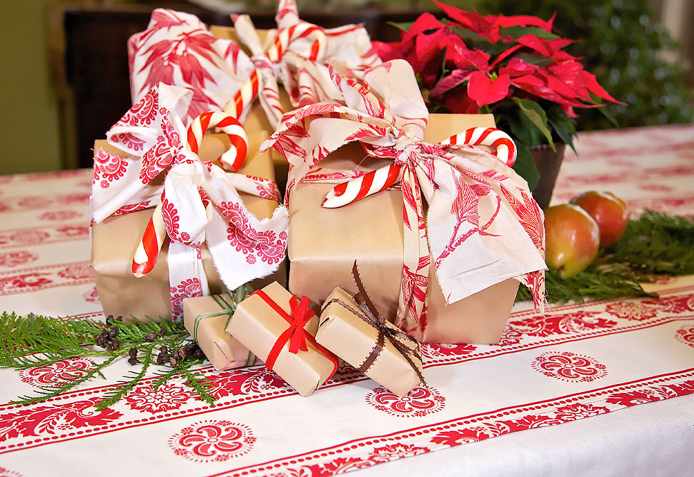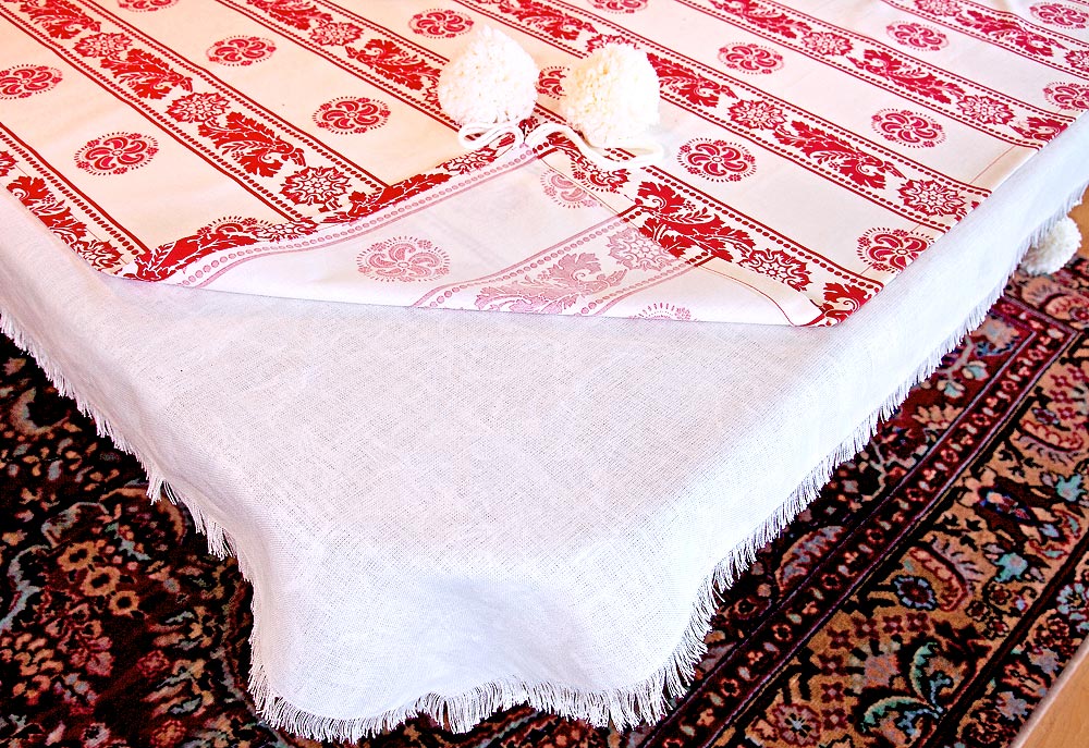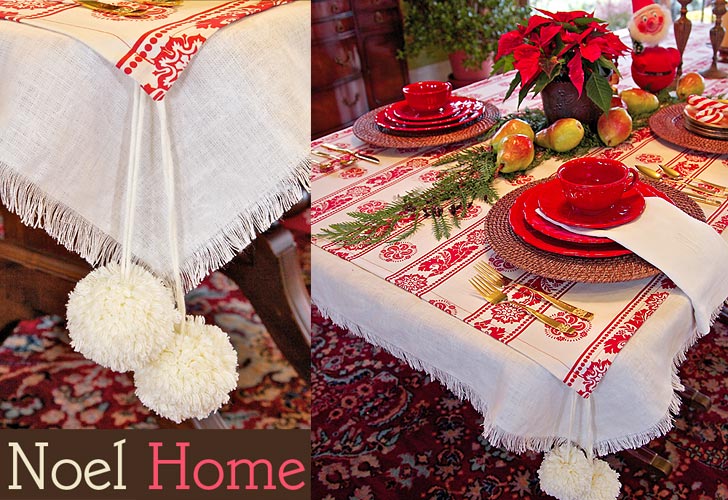 The experts always recommend layers when dressing for winter; we felt this advice should extend to winter table top dressing as well. Our holiday tablecloth is actually two layers: a plain fringed underlay and a patterned flat overlay with pretty pairs of dangling pom-poms as corner accents. With the underlay made out of a neutral fabric in a simple fringed design, you can reuse it with a new overlay for a new season or holiday.