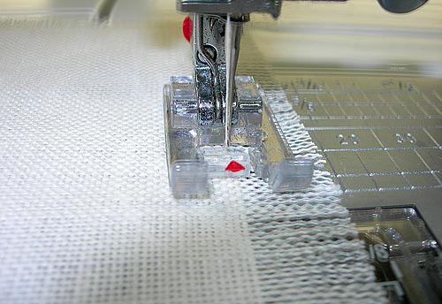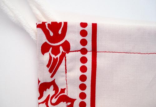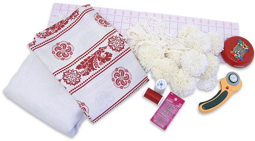 - Topstitch close to the inner folded edge all around tablecloth hem, making sure to back tack over each of the pom-pom tails, to insure they are stitched tightly in place.