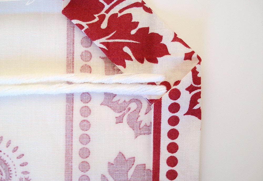 NOTE: We made neat diagonal point corners, using our favorite tutorial on clean finished corners. - Place a pair of pom poms (one 8″ and one 6″) at each corner. To do this, unfold your double-turned hem to a single-turned hem, line up the pom-pom tails (each pom has two tails), and slide them into the hem.