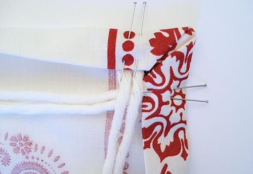 - Slide one pom on one side of the corner and one pom on the other side so the tails criss-cross each other at a right angle. Refold the hem to cover the ends. Pin in place.