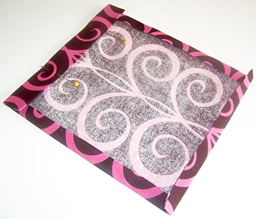 - Place the knit fabric over the lining with right sides together, aligning all the raw edges. Pin in place.