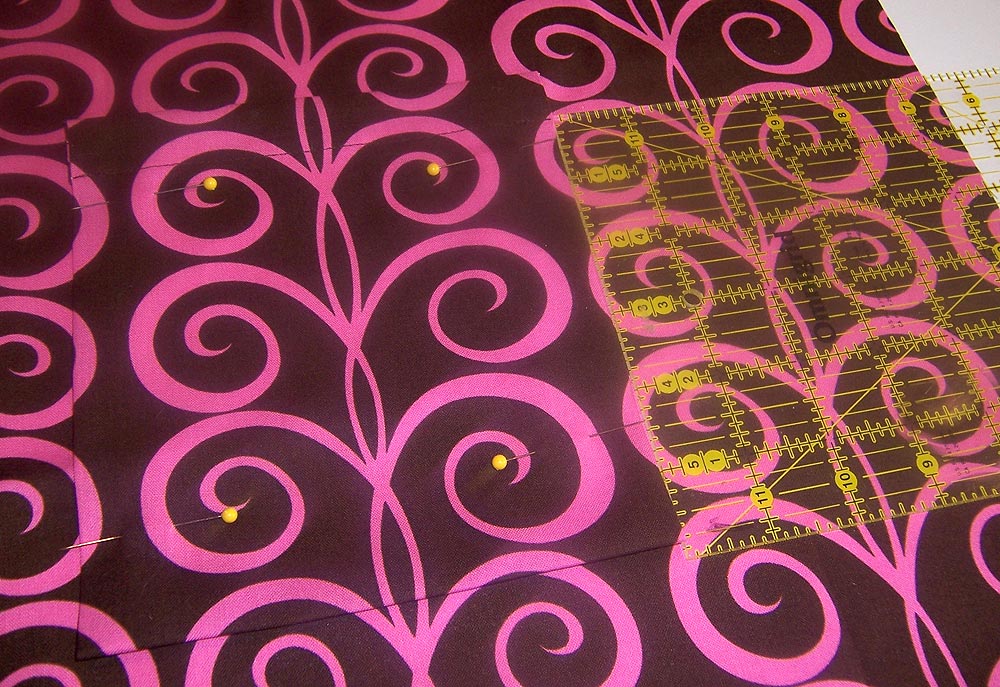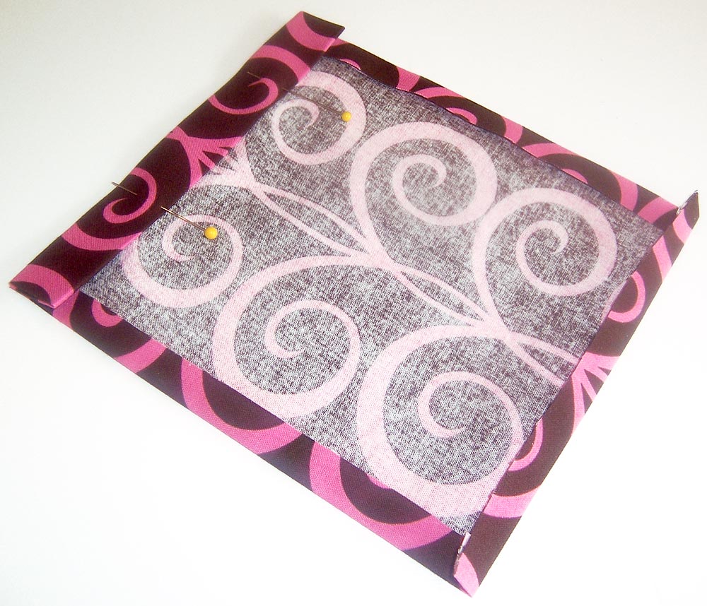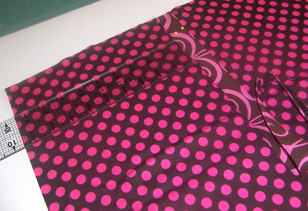 - Position the pocket on the lining 5½” from the right raw edge and 4″ up from the lower raw edge. You can adjust the position as necessary to best match your fabric’s pattern (remember, we matched our pocket to the base panel). Pin in place.