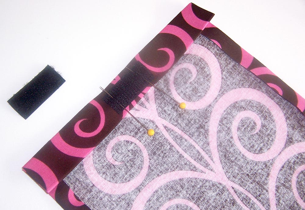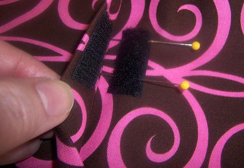 - Find the 1½” length of Velcro®. Pull it apart into its two layers. Center the hook layer (the scratchy side) on the double hem. Pin in place.