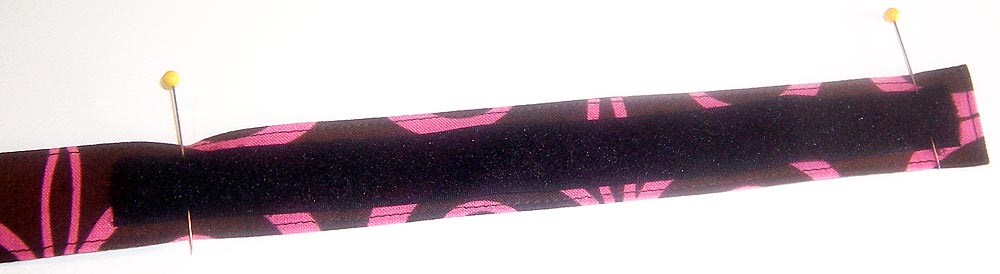 - Find the 8″ length of Velcro®. Pull it apart into its two layers. Position the loop side (the soft side) of the Velcro® at the folded end of the strap, centering it between the lines of stitching. Pin in place. Set aside the 8″ hook side for later use.