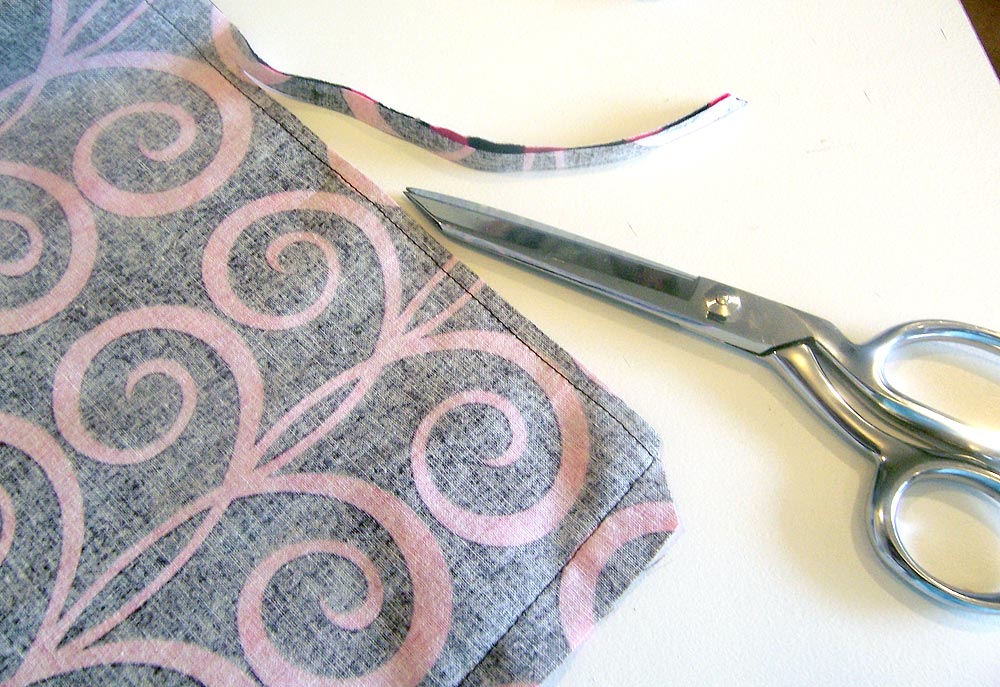 - Trim each corner, then trim back the upper edge seam allowance to ¼”.
