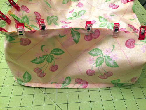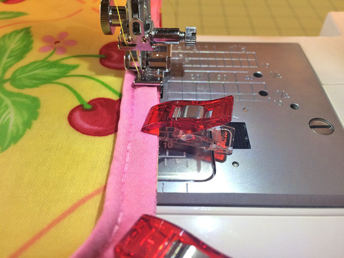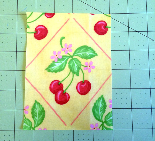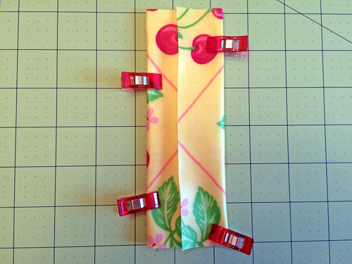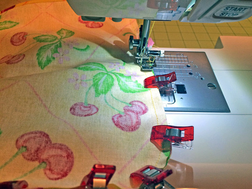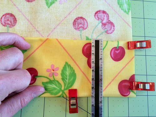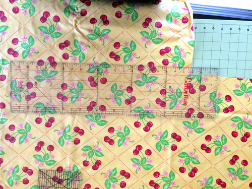 ANOTHER NOTE: Printed designs are not always 100% straight. We found this to be true with our cherries laminate, as you can see in the photo below. When this happens, you must find the the straightest point of the motif or cut the strips in sections and piece them back together to get a nice, even side loop. This is why we always recommend getting ¼ to ½ yard extra when precise fussy cutting and pattern matching is involved.